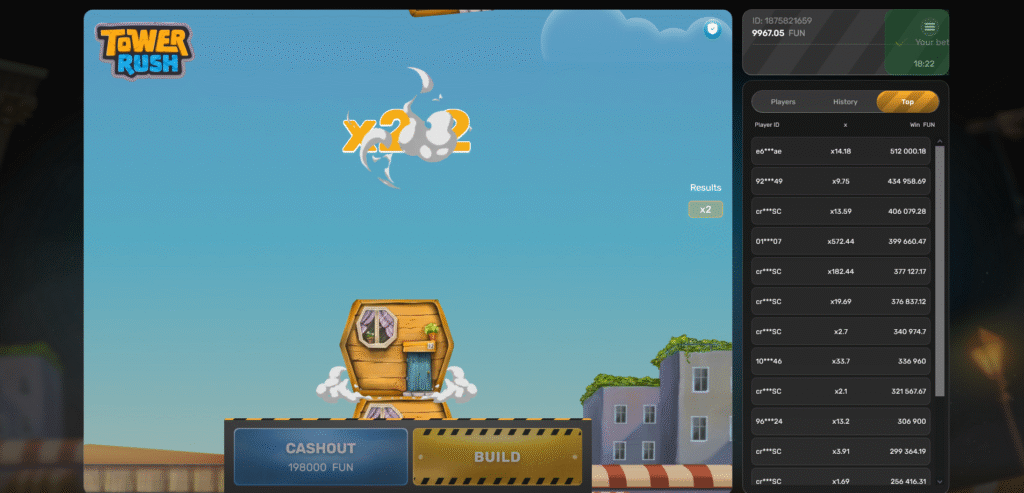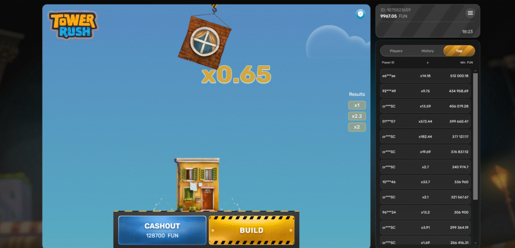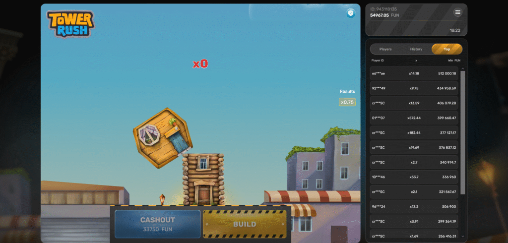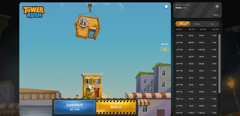 The concept is based on precise timing. A suspended house swings above your construction in progress, and you have to click at the optimum moment to make it fall. exactly on the previous floor. Each successful placement earns you a random multiplier that is added to your potential winnings.