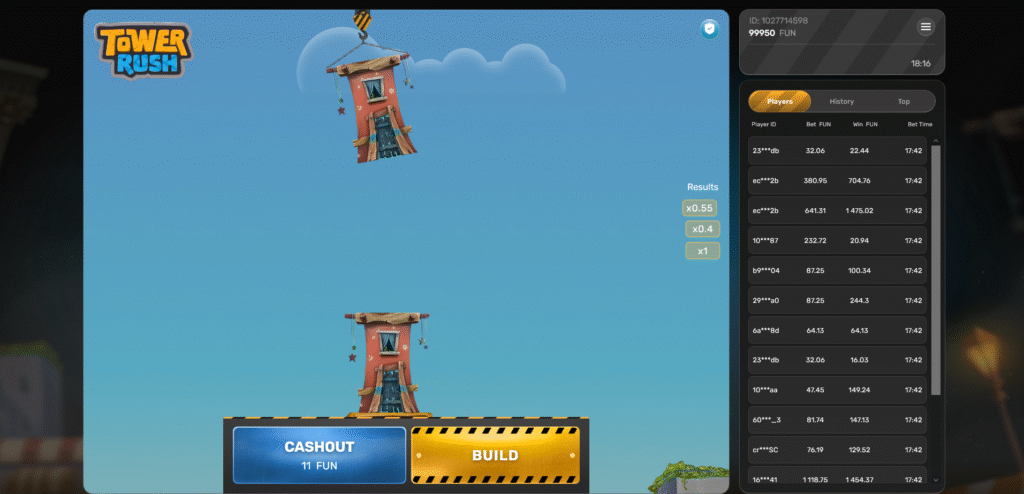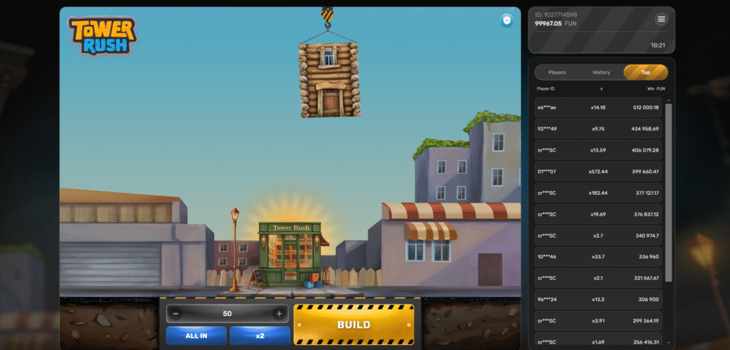 Tower Rush completely redefines the experience of instant casino games. Unlike traditional crash games, where players remain passive, this title from Galaxsys puts you at the controls of a virtual crane to build the most impressive building possible.